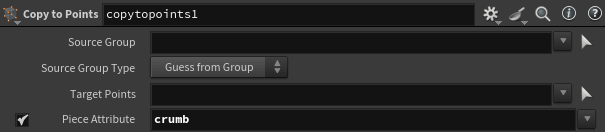 After bringing the cached points back into SOPs, I used Copy to Points and the piece attribute to replace the particles with variations of geo for cookie crumbs.