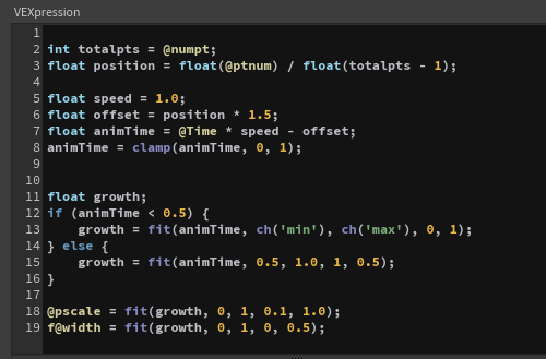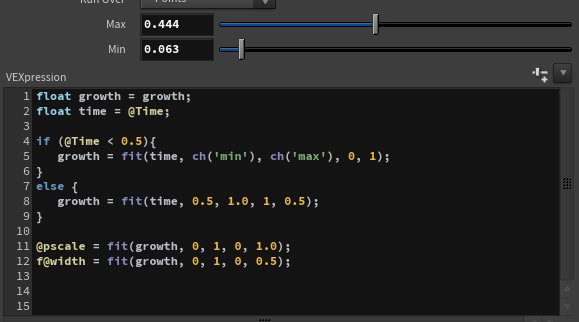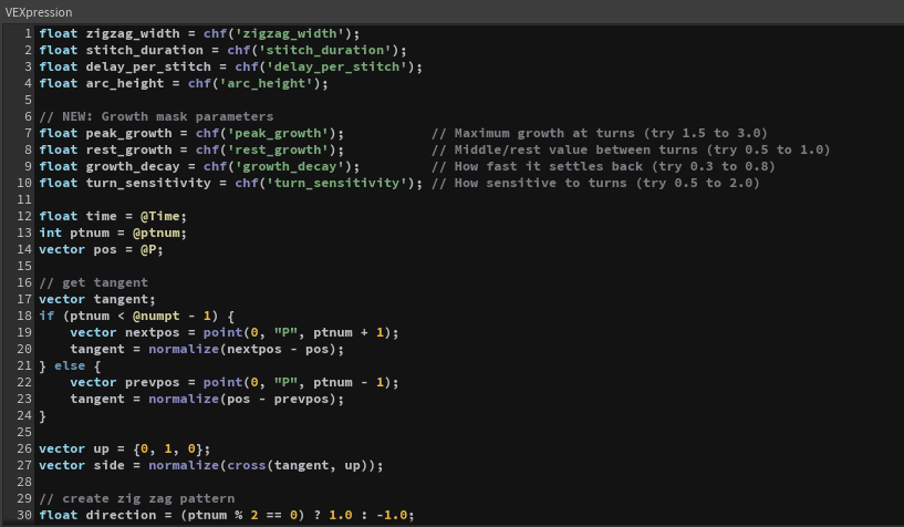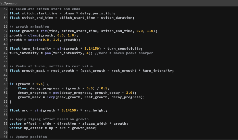 - I used vex to make the stitches grow large, then settle to a middle value